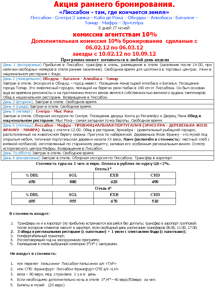 10 Фев 2012 14:06:00 ПОРТУГАЛИЯ - "Лиссабон, там где кончается земля", 8дн/7н от фирмы ПРОТРЕВЭЛ
