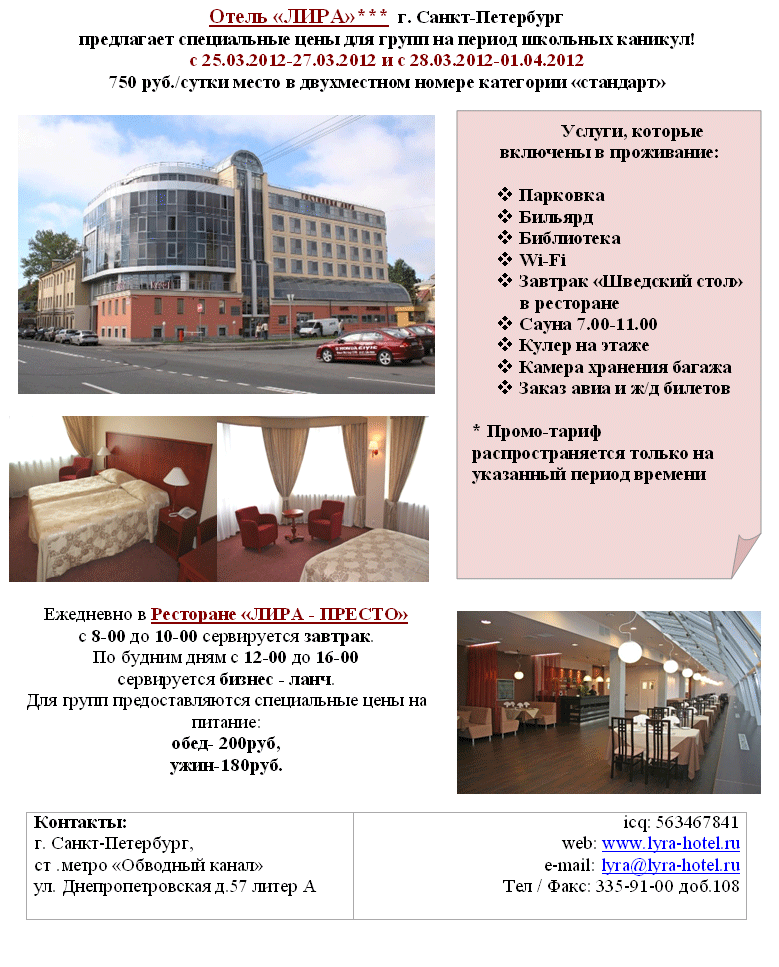 05 Мар 2012 13:37:07 РОССИЯ - СПб - РАЗМЕЩЕНИЕ - спец-цены на школьные каникулы от фирмы ЛИРА ГРАНД