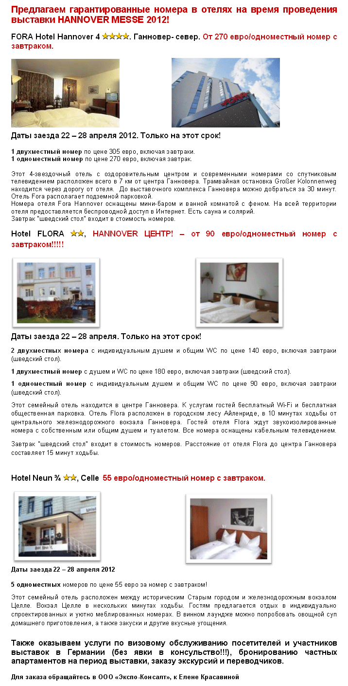 28 Мар 2012 12:08:15 ГЕРМАНИЯ 22.04-28.04 Hannover Messe 2012 - спо отелей от фирмы ЭКСПО-КОНСАЛТ