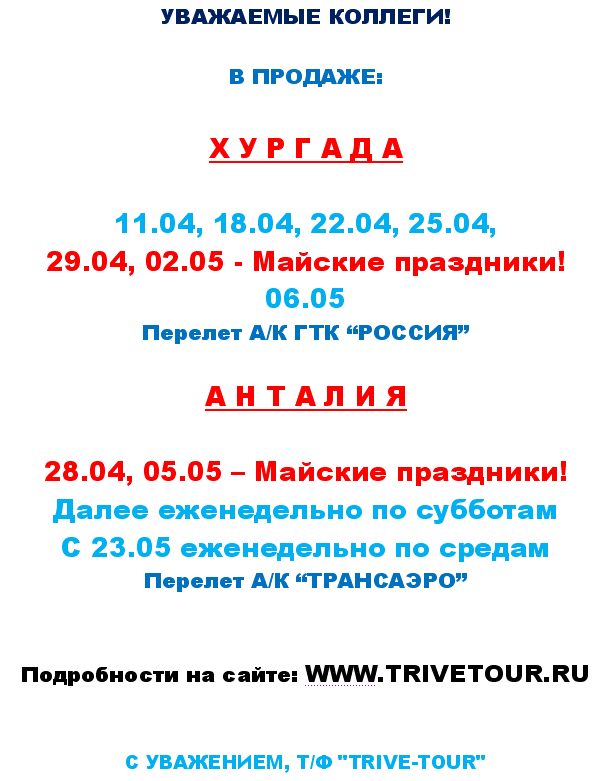 ЕГИПЕТ - ХУРГАДА и ТУРЦИЯ - АНТАЛИЯ - сводка мест АПРЕЛЬ-МАЙ от фирмы TRIVE ТУР |