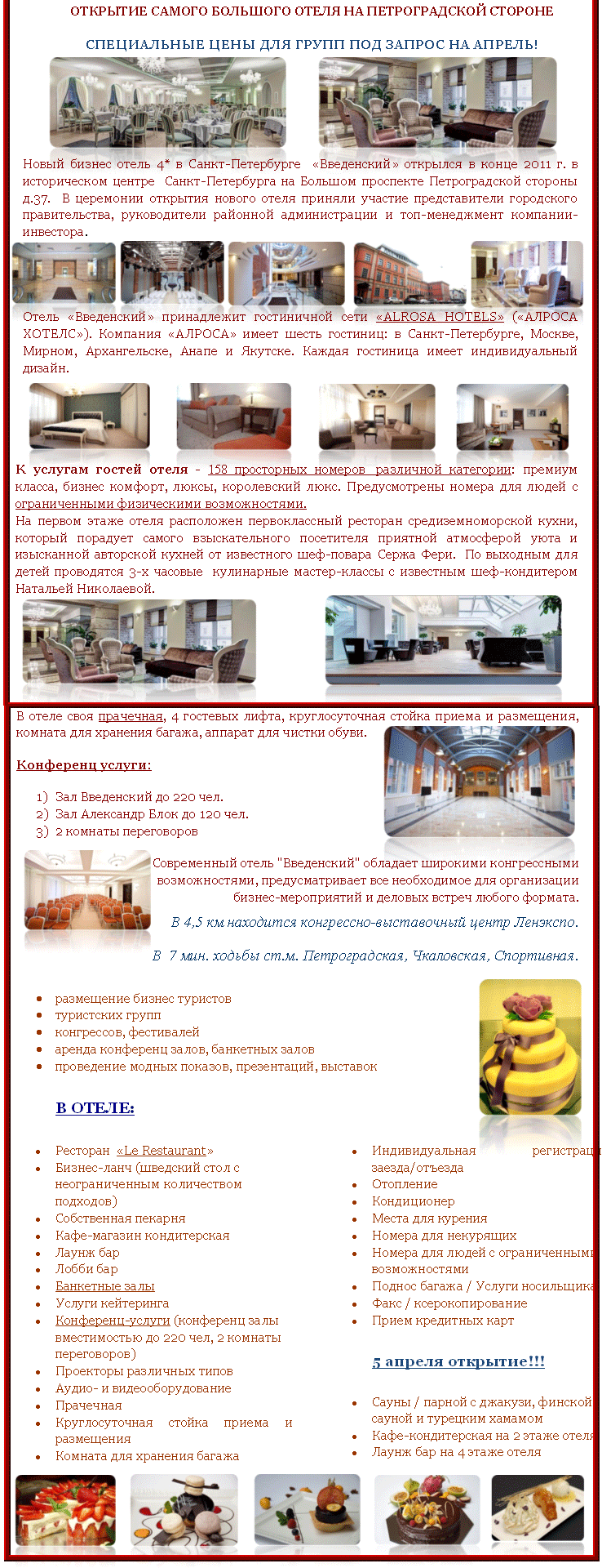 04 Апр 2012 14:06:38 РОССИЯ - СПб - Открытие года! Отель 4* Введенский. СПО для групп в АПРЕЛЕ от фирмы ОТЕЛЬ ВВЕДЕНСКИЙ