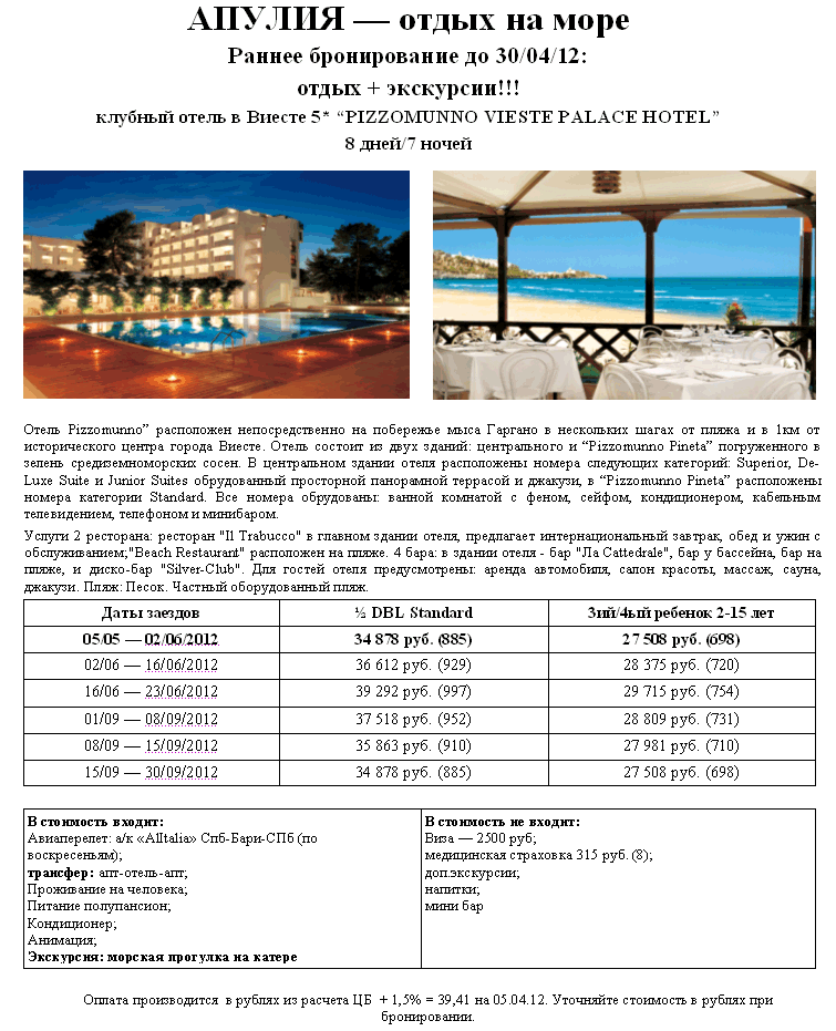 02 Май 2012 14:35:29 ИТАЛИЯ. Апулия. Раннее бронирование от фирмы АРТ-ТРЕВЕЛ