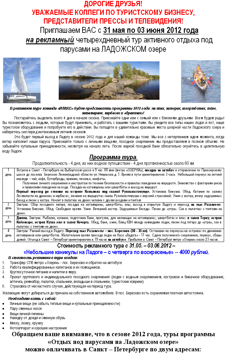 РЕКЛАМНЫЙ ТУР 31.05-03.06 Отдых под парусами на Ладожском озере от фирмы ПРОФСОЮЗНАЯ ТУРИСТСКАЯ КОМПАНИЯ |