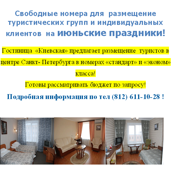 30 Май 2012 13:17:28 РОССИЯ - СПб. Свободные номера на июньские праздники для размещения туристов от фирмы ГОСТИНИЦА КИЕВСКАЯ