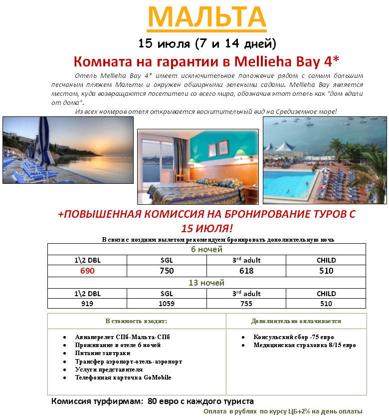 09 Июл 2012 11:05:00 МАЛЬТА 15.07 на 07/14н - Mellieha Bay 4* от фирмы ИВОЛГА