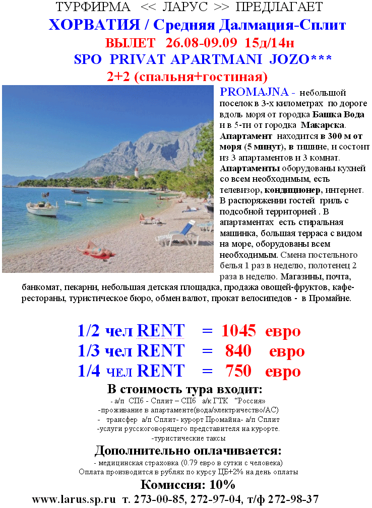 14 Авг 2012 12:57:17 ХОРВАТИЯ - Далмаци я(а/п Сплит)- Промайна (Макарска Ривьера) 26.08-09.09 privat apartmani JOZO *** 2+2 от фирмы ЛАРУС