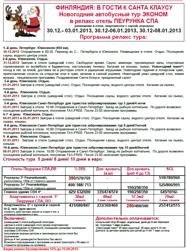 31 Авг 2012 20:11:11 ФИНЛЯНДИЯ. В ГОСТИ К САНТА КЛАУСУ. ЭКОНОМ ТУР В ПЕУРУНКА СПА НА НОВЫЙ ГОД И ЗИМНИЕ КАНИКУЛЫ от фирмы ICS TRAVEL GROUP