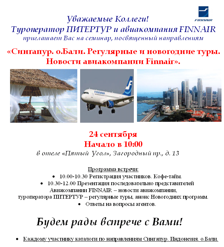 СЕМИНАР 24.10 СИНГАПУР, ИНДОНЕЗИЯ - бизнес-завтрак от Finnair и от фирмы ПИТЕРТУР |