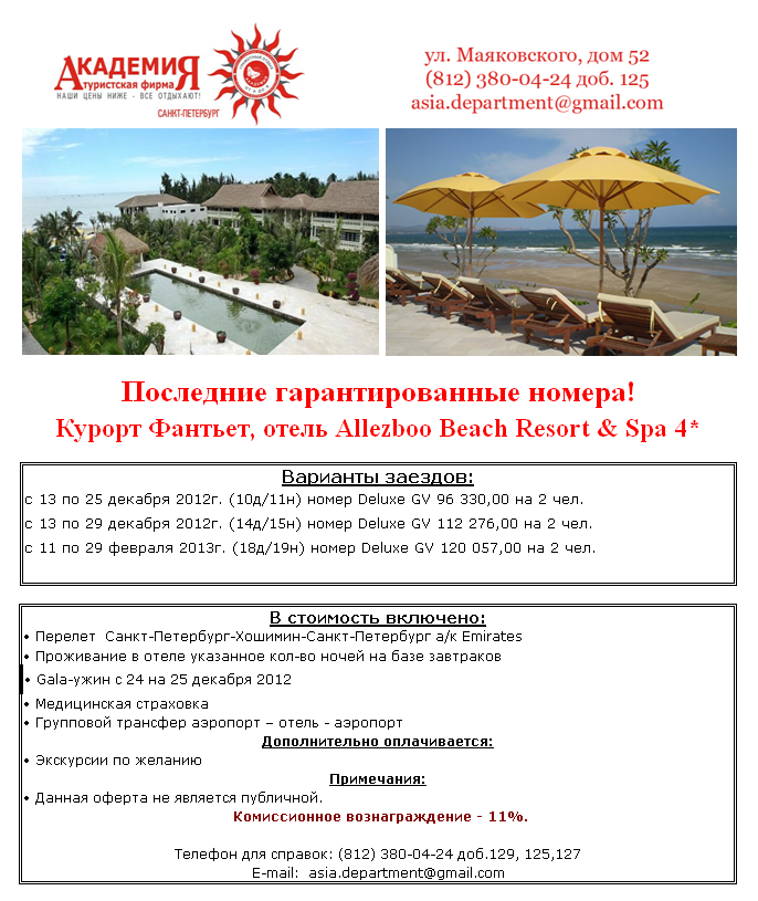 ВЬЕТНАМ. Гарант. места в отеле Allezboo Beach декабрь-февраль. Комиссия 11% от фирмы АКАДЕМИЯ