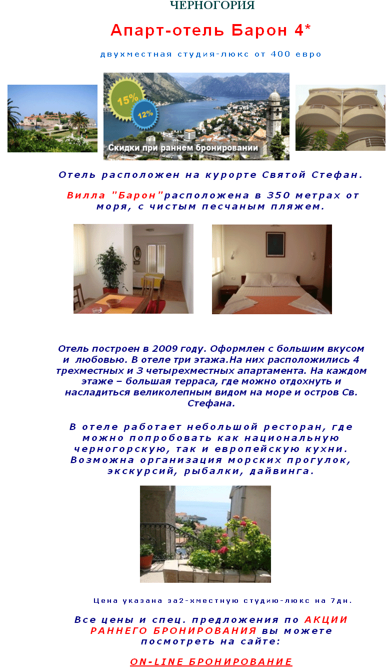 11 Дек 2012 12:40:13 ЧЕРНОГОРИЯ - апарт-отель Барон 4*, раннее бронирование, скидки до 15% от фирмы СИНЯЯ ПТИЦА ПЛЮС