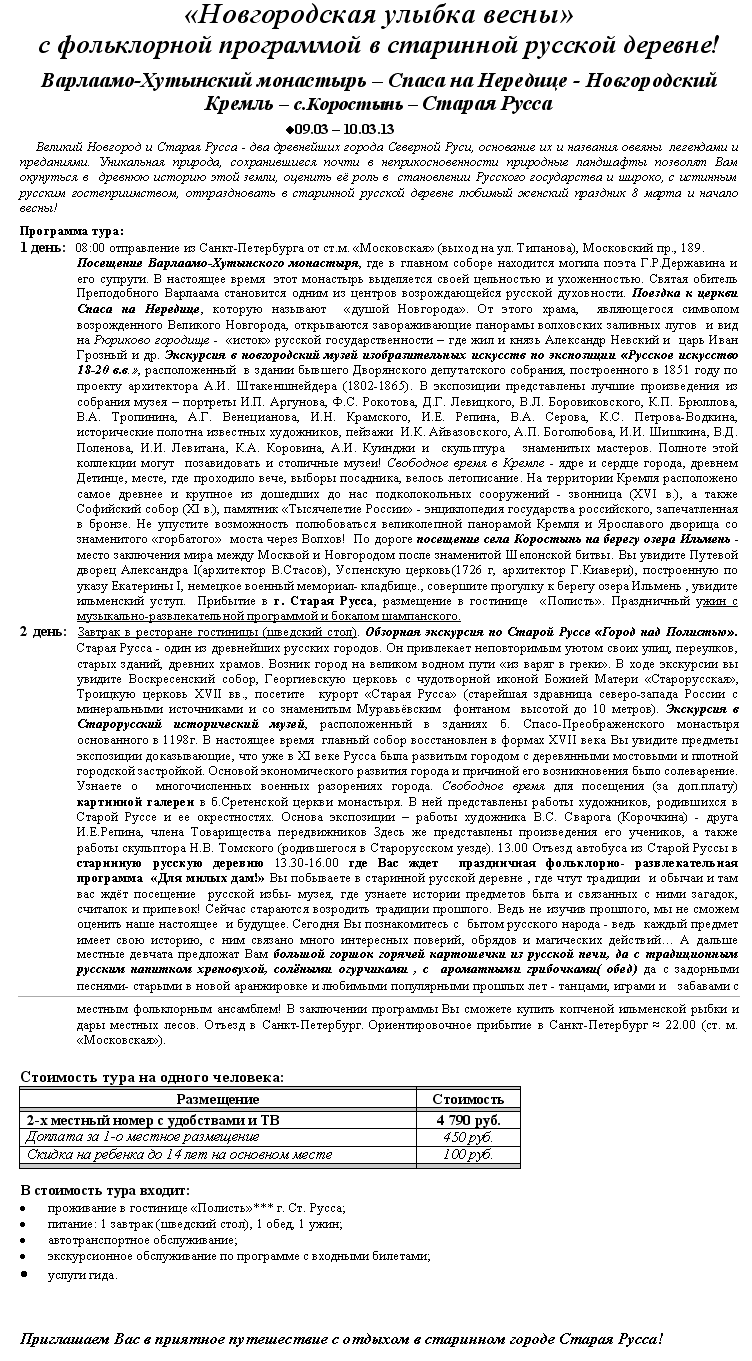 18 Янв 2013 09:34:23 РОССИЯ 09.03-10.03 "Новгородская улыбка весны" от фирмы СЕВЕРНАЯ ВЕНЕЦИЯ