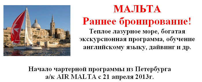 МАЛЬТА, раннее бронирование от фирмы ИВОЛГА |