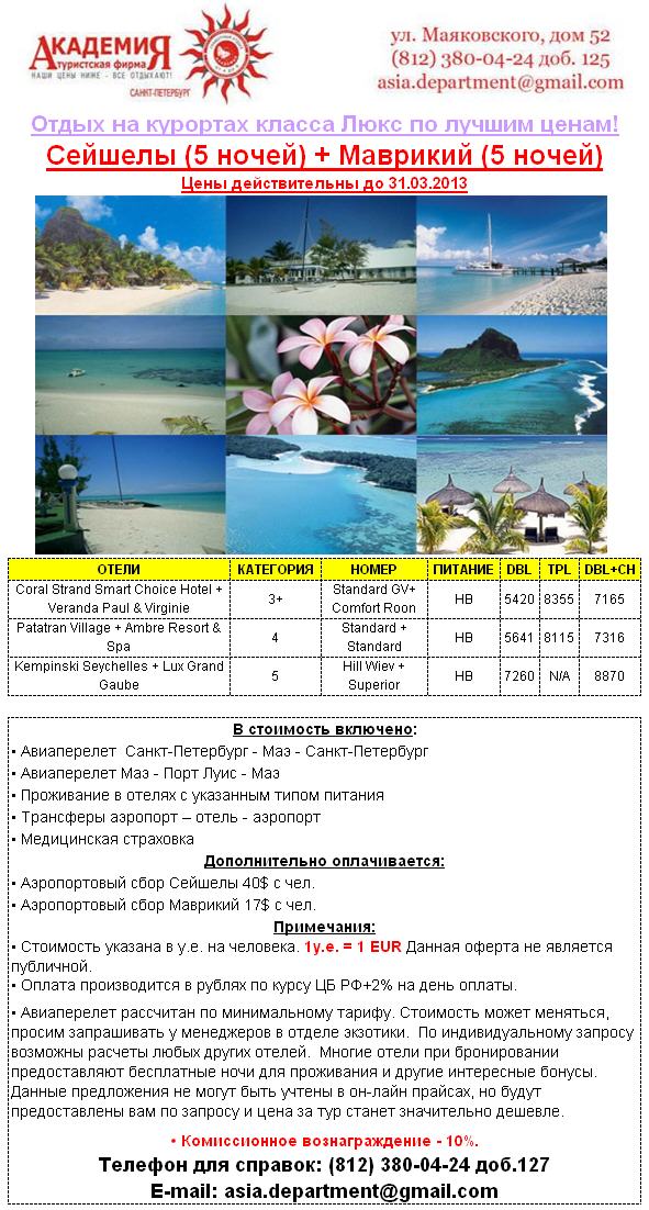 12 Фев 2013 10:59:09 СЕЙШЕЛЫ-МАВРИКИЙ, Отдых на самых шикарных пляжах мира от 2710EUR 10 ночей от фирмы АКАДЕМИЯ