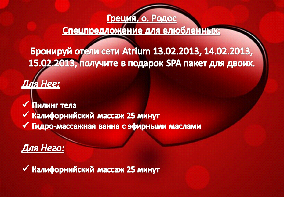 14 Фев 2013 11:44:15 ГРЕЦИЯ. РОДОС. Специальное предложение от отелей сети Atrium для влюбленных пар от фирмы СОЛВЕКС