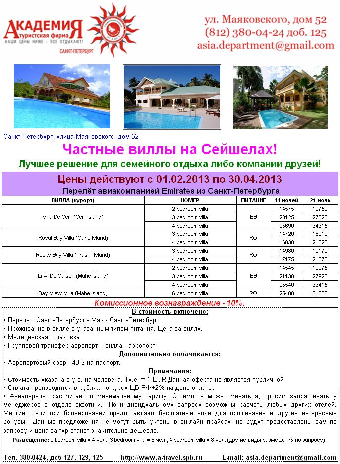 25 Фев 2013 10:55:49 СЕЙШЕЛЫ. Частные виллы от 2630 EUR c чел. за 21 ночь при размещении от 8 человек от фирмы АКАДЕМИЯ
