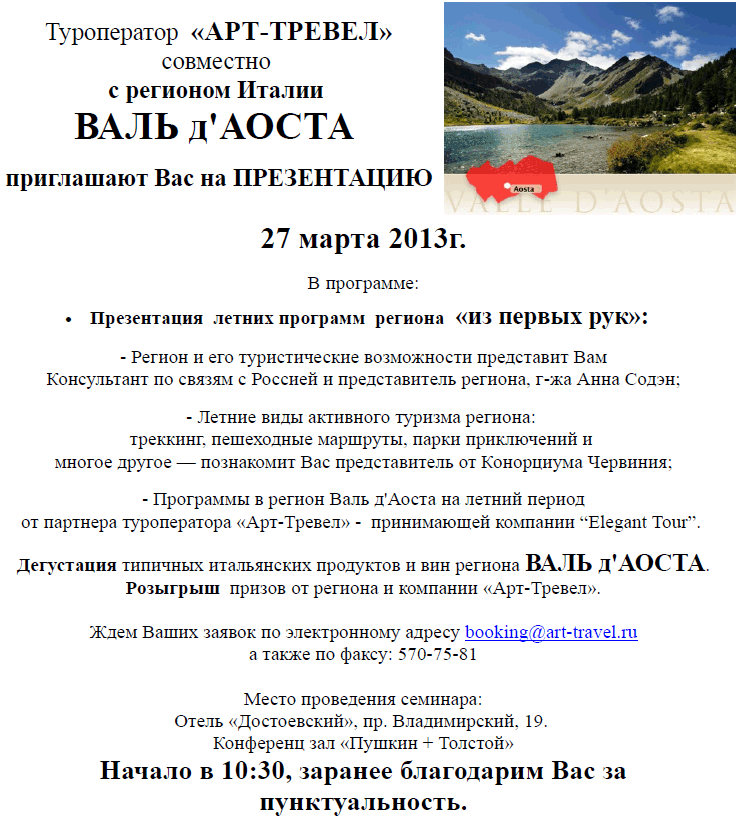12 Мар 2013 12:36:33 СЕМИНАР 27.03.2013 Италия совместно с регионом Валь д*Аоста от фирмы АРТ-ТРЕВЕЛ