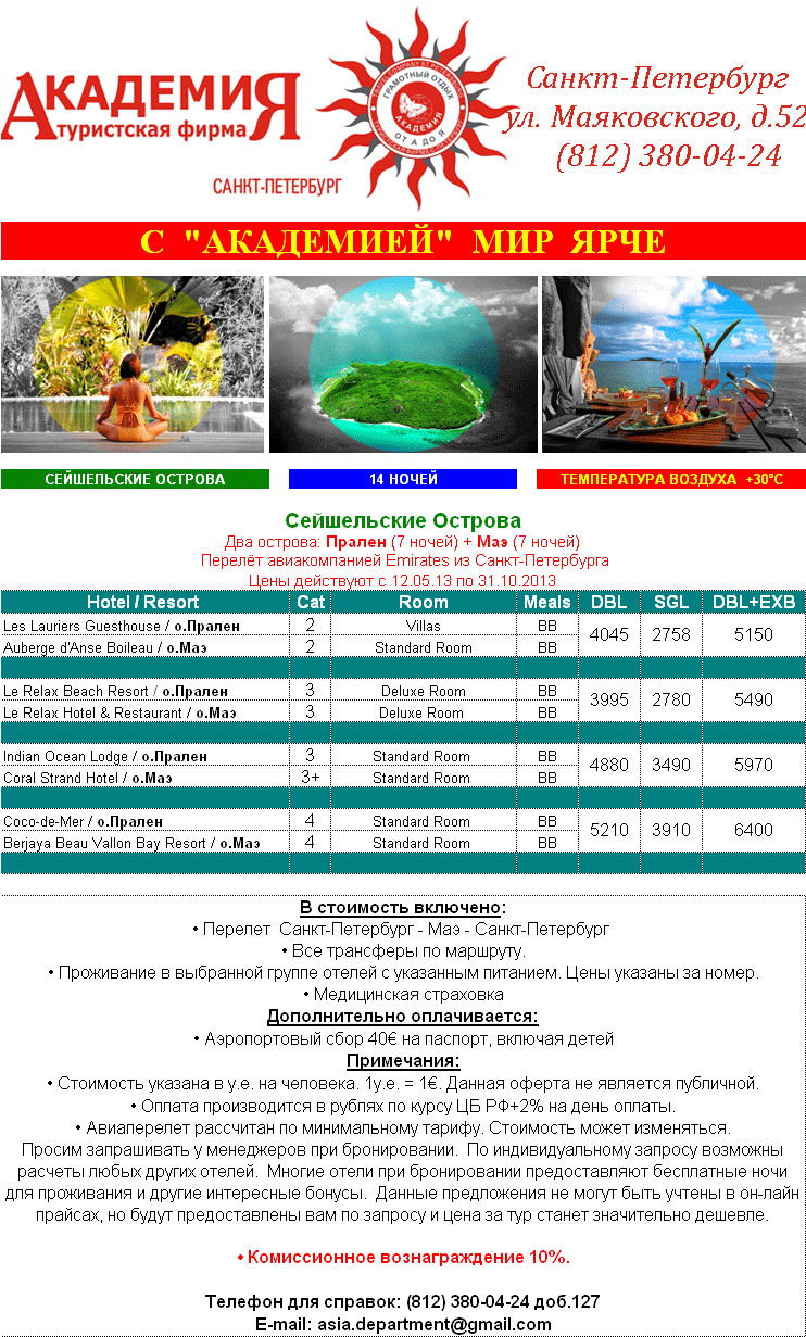 15 Апр 2013 13:36:45 СЕЙШЕЛЫ. Маэ+Прален 14 ночей от 1997 EUR 1/2 DBL от фирмы АКАДЕМИЯ