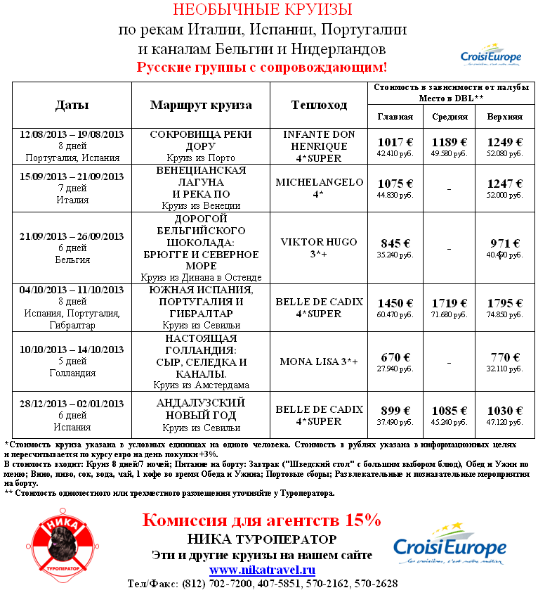 28 Май 2013 22:43:47 ЕВРОПА Необычные речные круизы - Италия, Испания, Португалия; круизы по каналм Бельгия и Нидерланды от фирмы НИКА