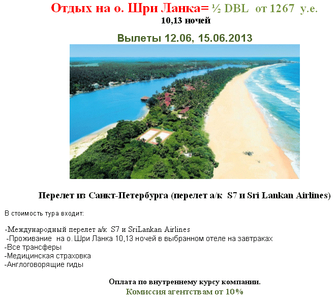 07 Июн 2013 12:32:42 ШРИ-ЛАНКА 12.06 и 15.06 от 41 500 руб из СПб от фирмы ITM GROUP