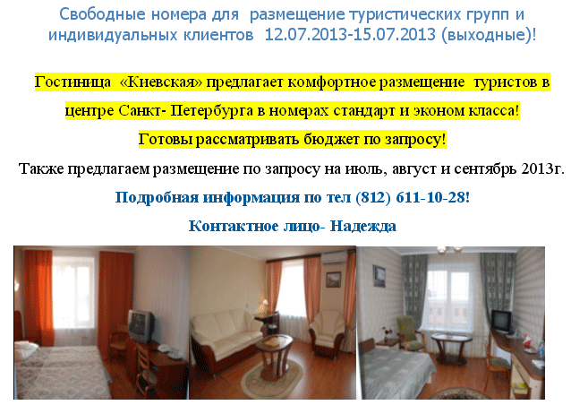 06 Июл 2013 00:28:19 РОССИЯ - СПб - гост. Киевская - спо на 12.07-15.07 и на июль-сентябрь от фирмы ГОСТИНИЦА КИЕВСКАЯ