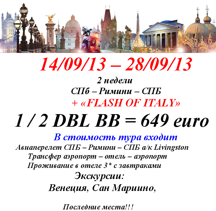 11 Сен 2013 18:46:47 ИТАЛИЯ. Римини 14.09-28.09 1/2 DBL BB = 649 euro от фирмы ФЛАМИНГО