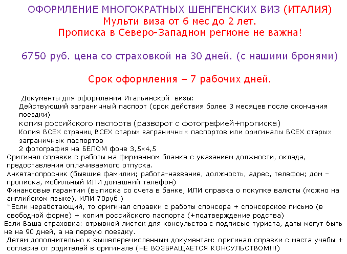 07 Окт 2013 12:37:20 ОФОРМЛЕНИЕ Мульти-Шенген Виз в Италию 6750 руб (7 раб. дней) от фирмы ТВОЙ ТУР