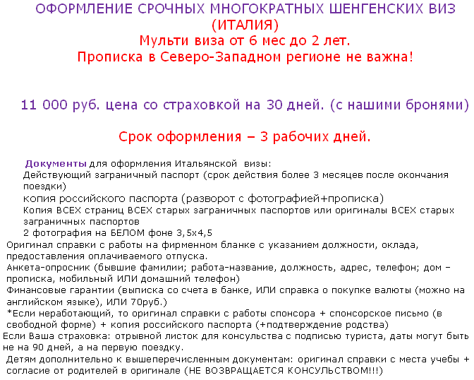 07 Окт 2013 12:39:04 ОФОРМЛЕНИЕ СРОЧНОЕ Мульти-Шенген Виз в Италию 11 000 руб (3 раб. дня) от фирмы ТВОЙ ТУР
