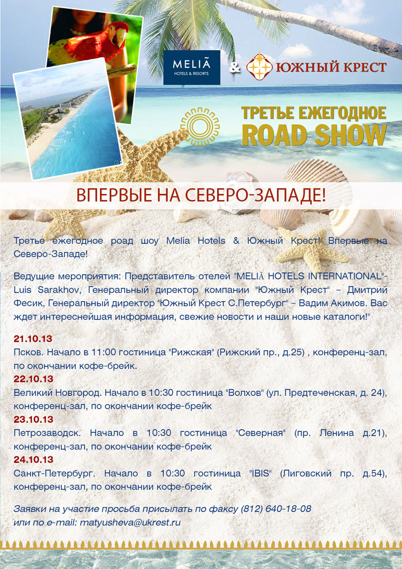 СЕМИНАРЫ Road Show MELIA HOTELS 24.10 в СПб, 21.10 в Пскове, 22.10 в Вел. Новгороде, 23.10 в Петрозаводске от фирмы ЮЖНЫЙ КРЕСТ |