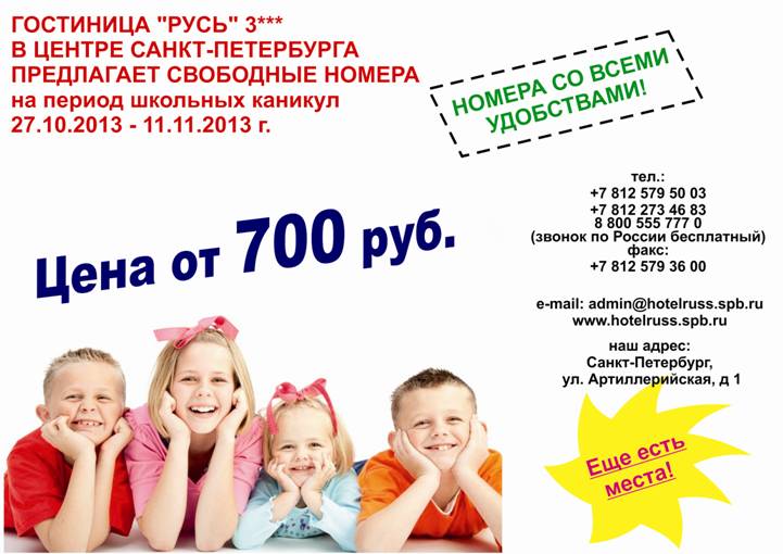 21 Окт 2013 11:50:31 РОССИЯ - СПБ - гост. РУСЬ: места на школьные каникулы в центре СПб от фирмы ГОСТИНИЦА РУСЬ