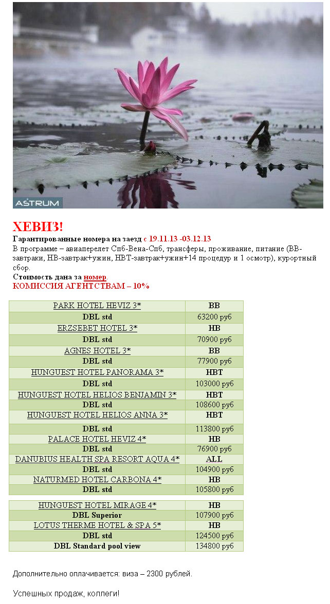 28 Окт 2013 15:17:10 ВЕНГРИЯ Хевиз 19.11-03.12 гарант. номера, ком. 10% от фирмы АСТРУМ ТРЭВЕЛ