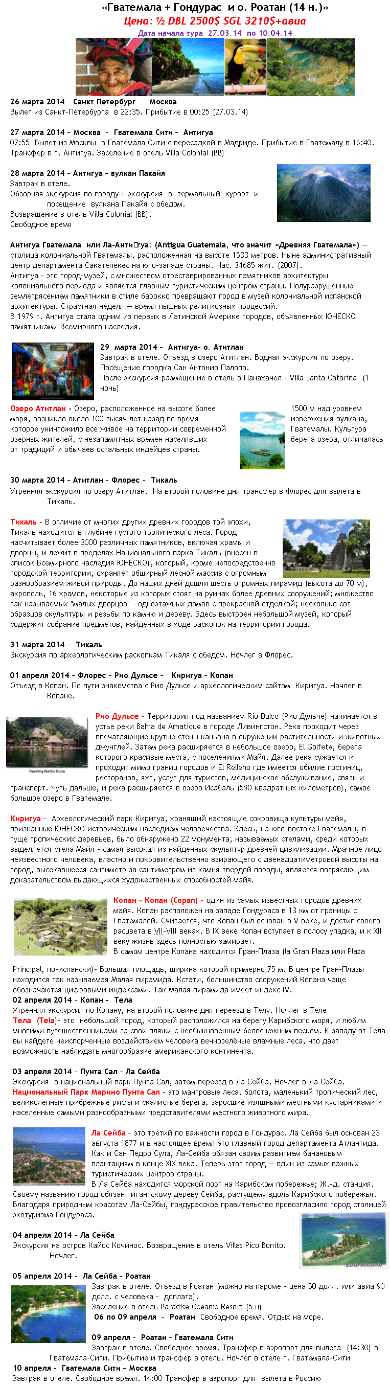 - 3 обеда во время экскурсии – Тикаль, Пунта Сал и