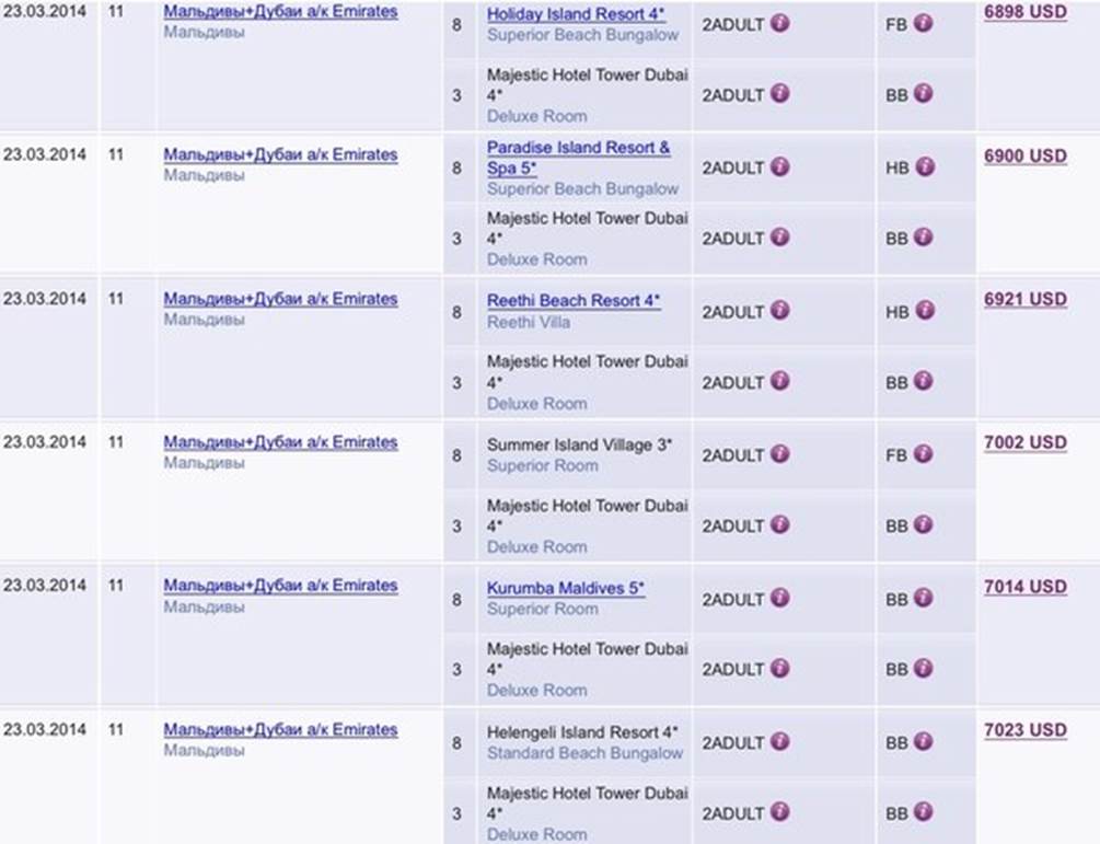 любые другие комбинации отелей (уточнять у