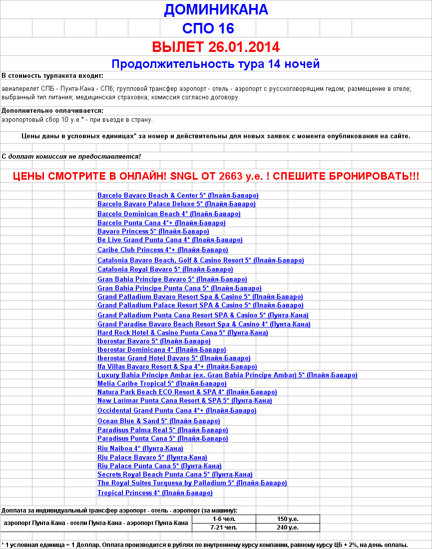 22 Янв 2014 10:37:22 ДОМИНИКАНА с 26.01.14 на 14 ночей SNGL от 2663 у.е. от фирмы ЮЖНЫЙ КРЕСТ