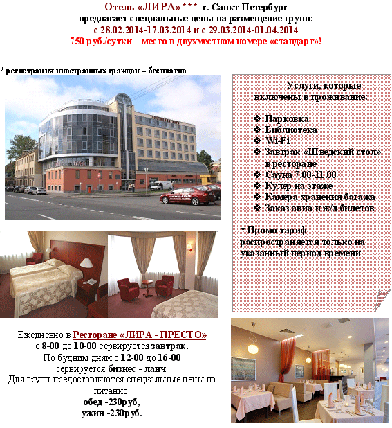 28 Фев 2014 12:31:05 РОССИЯ-СПБ размещение для групп в марте месяце от фирмы ГОСТИНИЦА ЛИРА